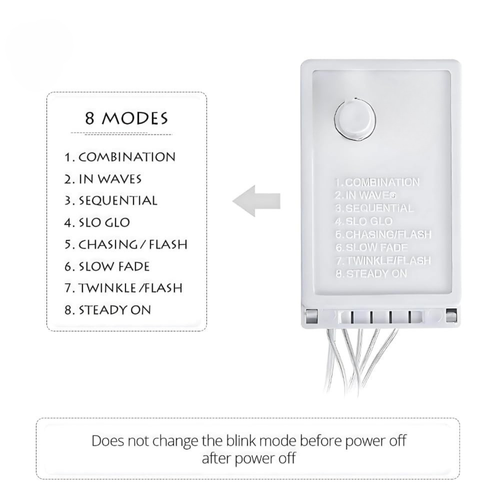 - 8 Adjustment Modes : combination; wave flash; flicker flash; continuous flash; slow flash; slow fade; fantasy dream flash; quickly flash, you can adjust the light patterns whatever you want